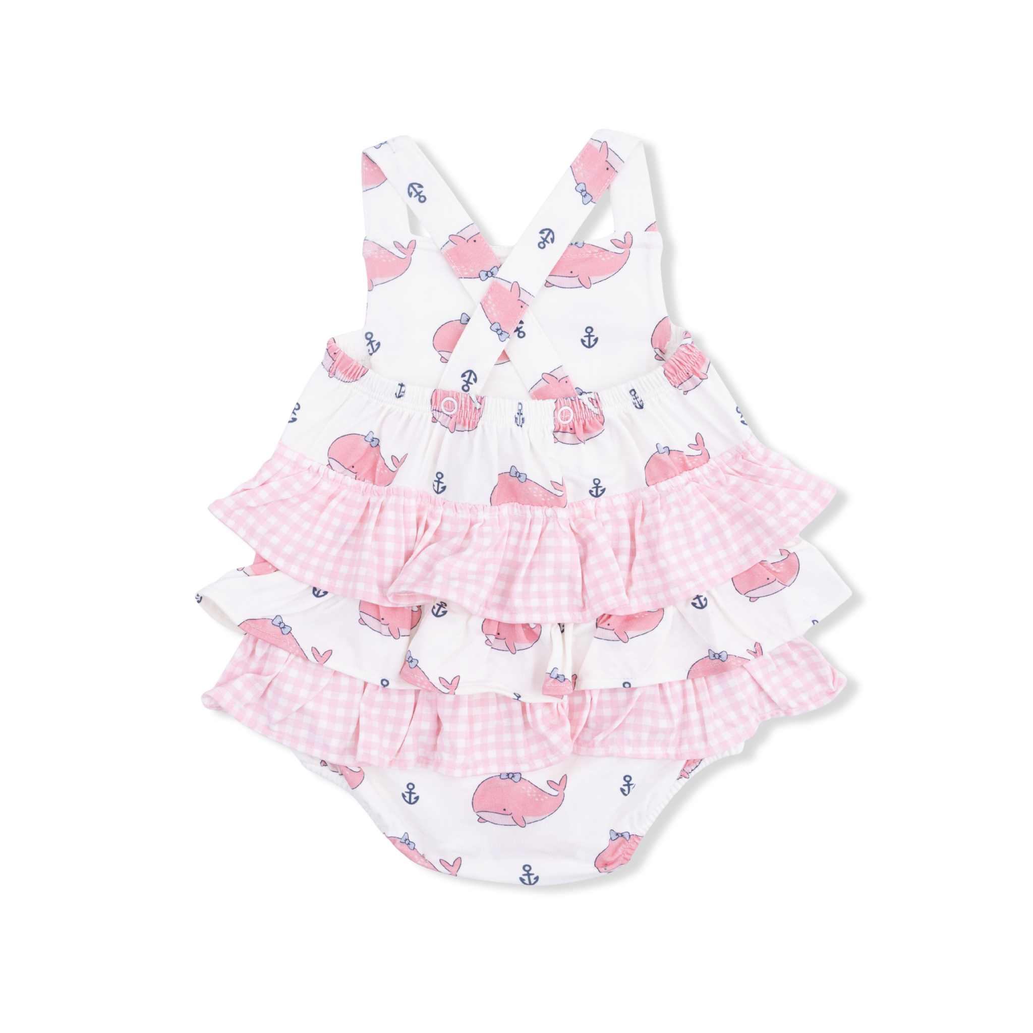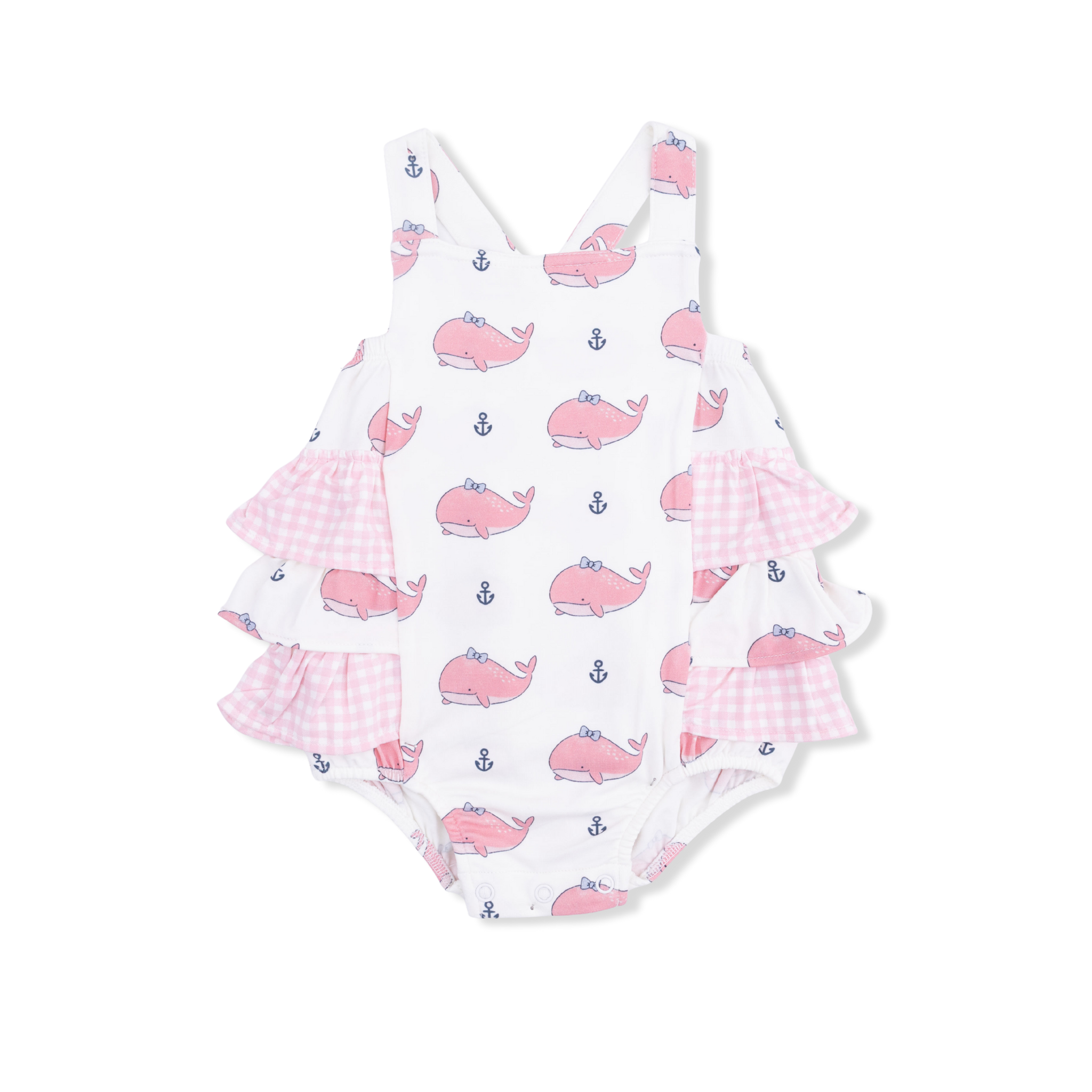 Dive into summer fun with this cheerful whale-print sunsuit featuring soft bamboo fabric and a sweet bow ruffle detail. Bamboo's natural breathability keeps your little swimmer cool and comfortable during beach days and poolside play. The playful bubbly whale design brings joy to every outing, while the bow accent adds an extra dash of charm. Perfect for active babies who love the water and sunny adventures.