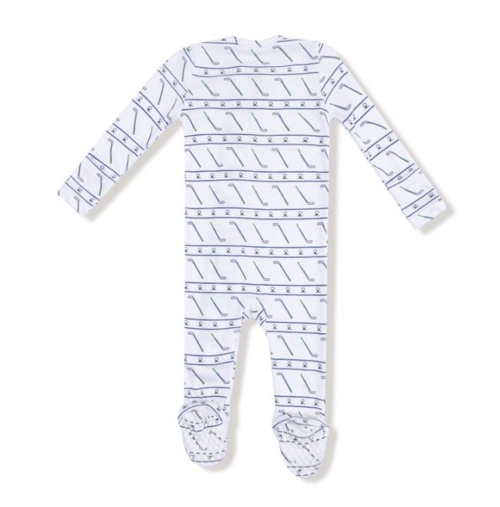 Keep your little one cozy and stylish with the Golf Club 2-Way Zipper Footie in a charming white and navy print. Made from soft ribbed modal fabric, this footie is perfect for fall and winter days or snuggly sleep time. The convenient 2-way zipper makes diaper changes a breeze, while the playful golf club design adds a touch of sporty fun to your baby’s wardrobe. Comfortable, cute, and easy to wear—this footie is a must-have for your little champion!