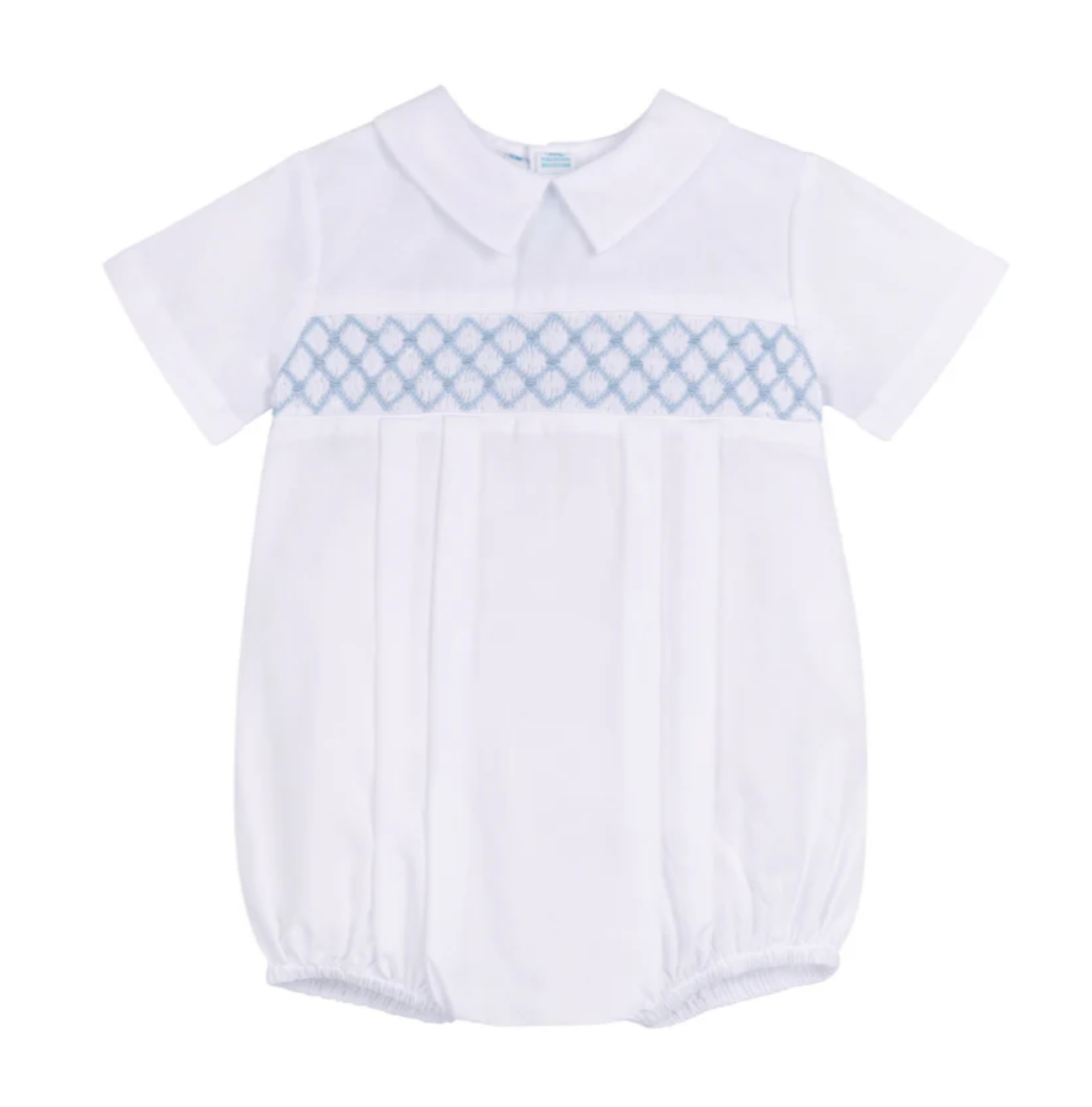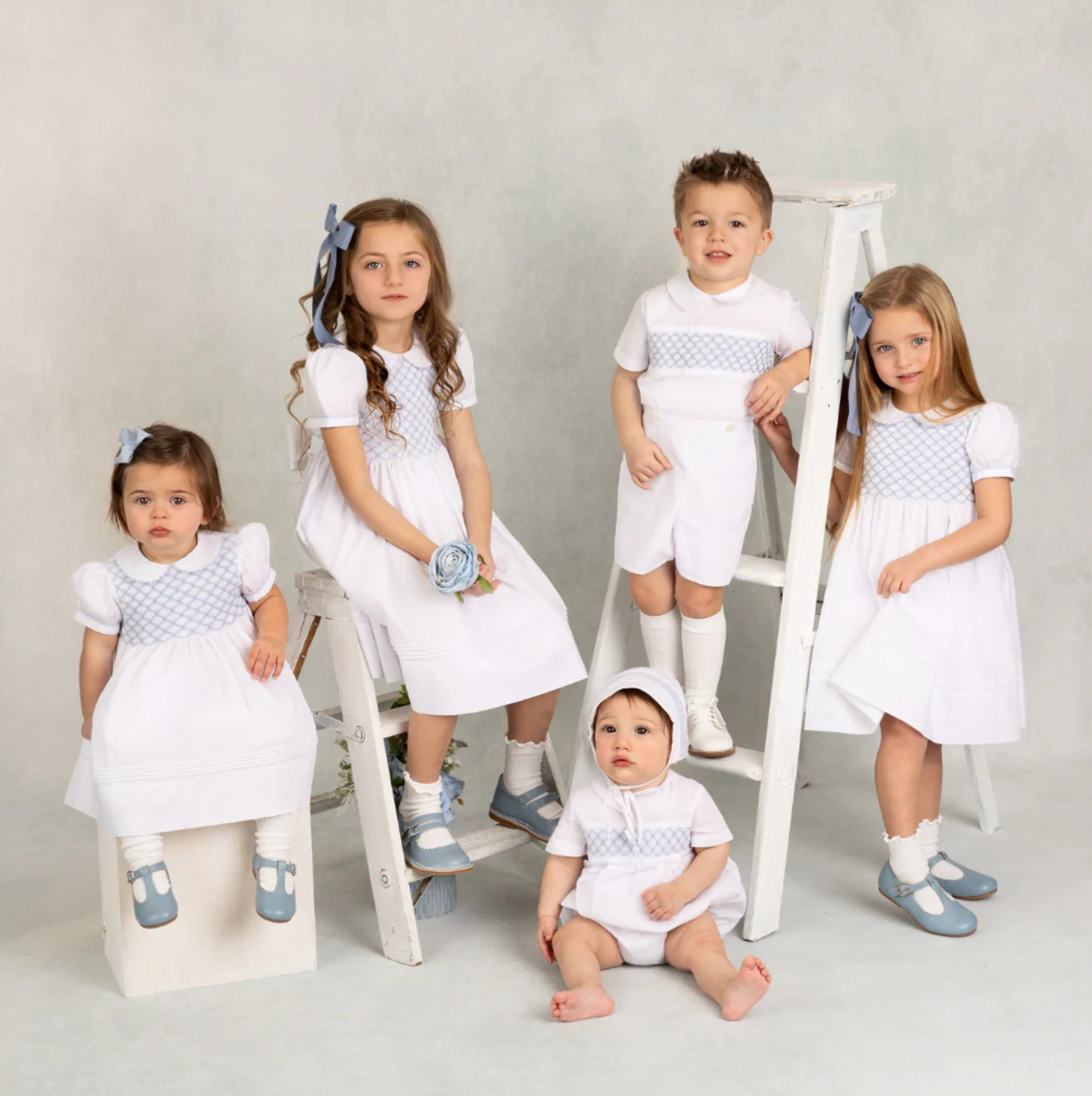 This smocked baby boy romper is classic Feltmans through and through! Designed with hand-embroidered smocking in timeless white with blue stitching. A beautiful outfit to add to your collection, with that signature Feltman style!