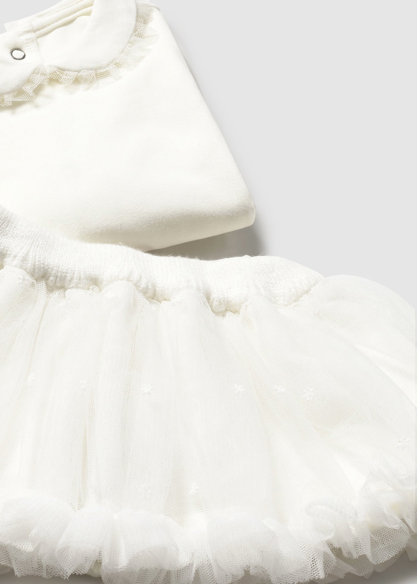 Wrap your little one in the sweetest style with this playful three-piece set in soft ecru white. The long-sleeved cardigan features charming ruffles and easy button closures, perfect for cuddles and comfort. The matching bodysuit has elasticated cuffs and convenient snap fastenings to make dressing a breeze. Complete with a cozy skirt that stays put thanks to the elastic waistband, this set is made for newborn fun and adorable moments.