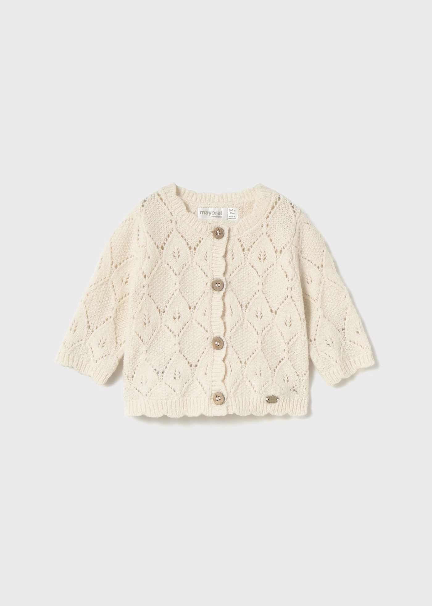 Wrap your little one in cozy charm with this Milk Heather Knit Cardigan. Featuring a playful waved collar and wood buttons down the front, it combines different fabrics for a one-of-a-kind look. The ribbed detailing adds a sweet touch, while the long sleeves keep your baby comfy and warm. Perfect for layering on cooler days with a soft, unique style.