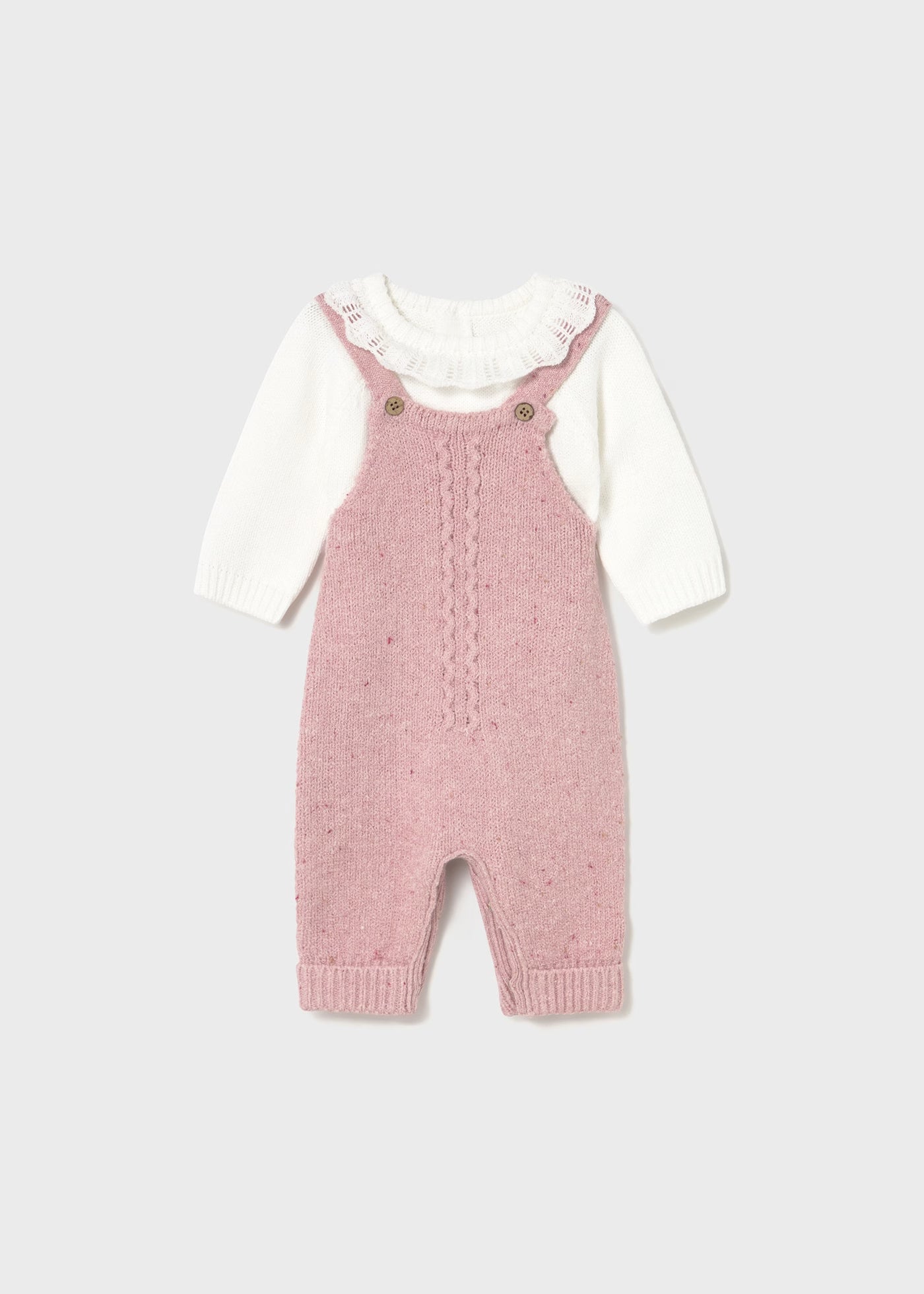 This adorable set features a pink knit dungaree with cute suspenders, paired with a white sweater boasting a wavy collar and easy back snap closure. Perfect for baby and toddler girls to stay cozy and stylish all fall and winter!