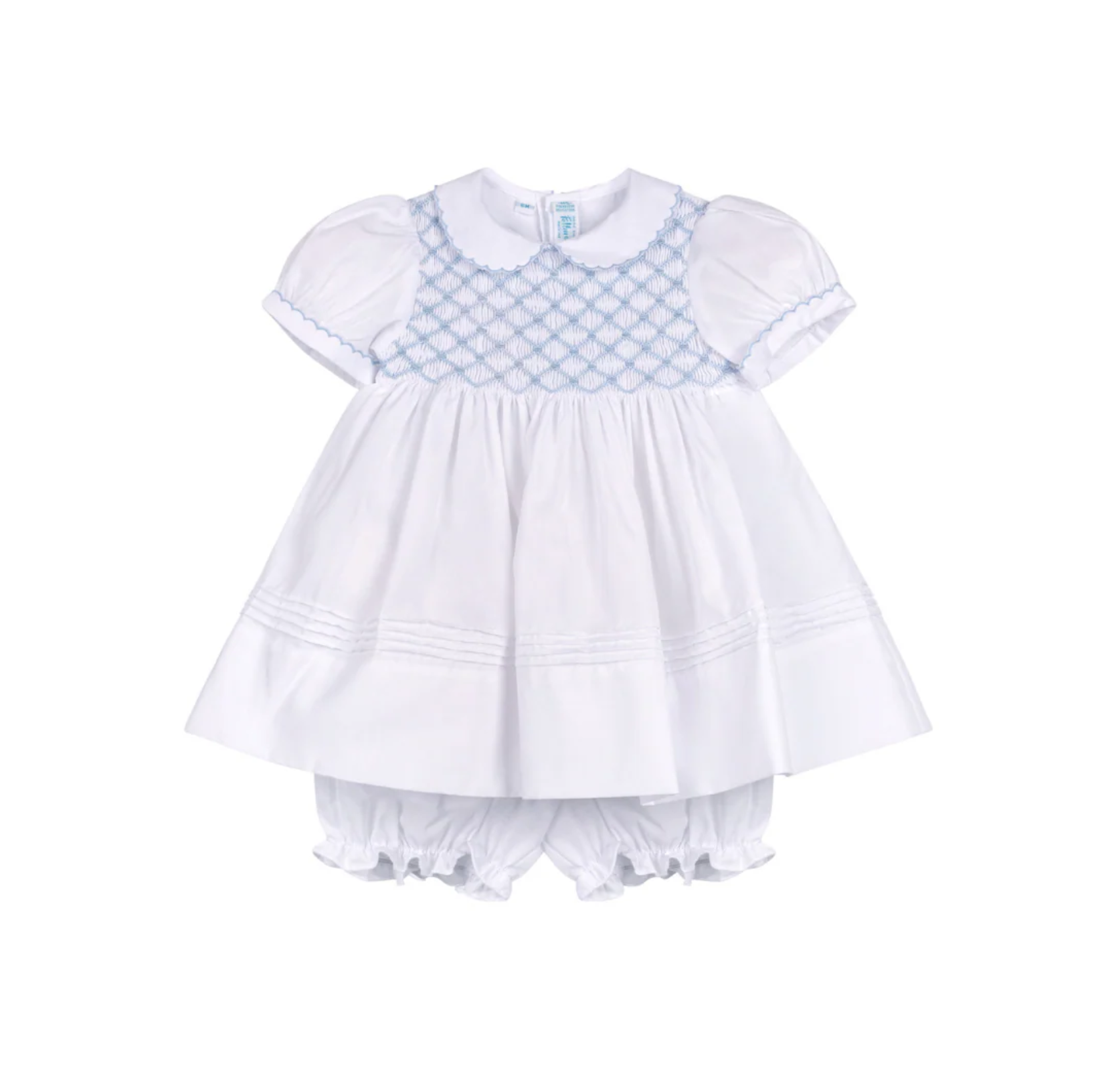 Meet the perfect smocked dress for your princess this spring! This classic dress is made with signature Feltman Brothers quality, made to last generations. All embroidery is hand-done, in classic blue and white stitching, and a fully-smocked bodice