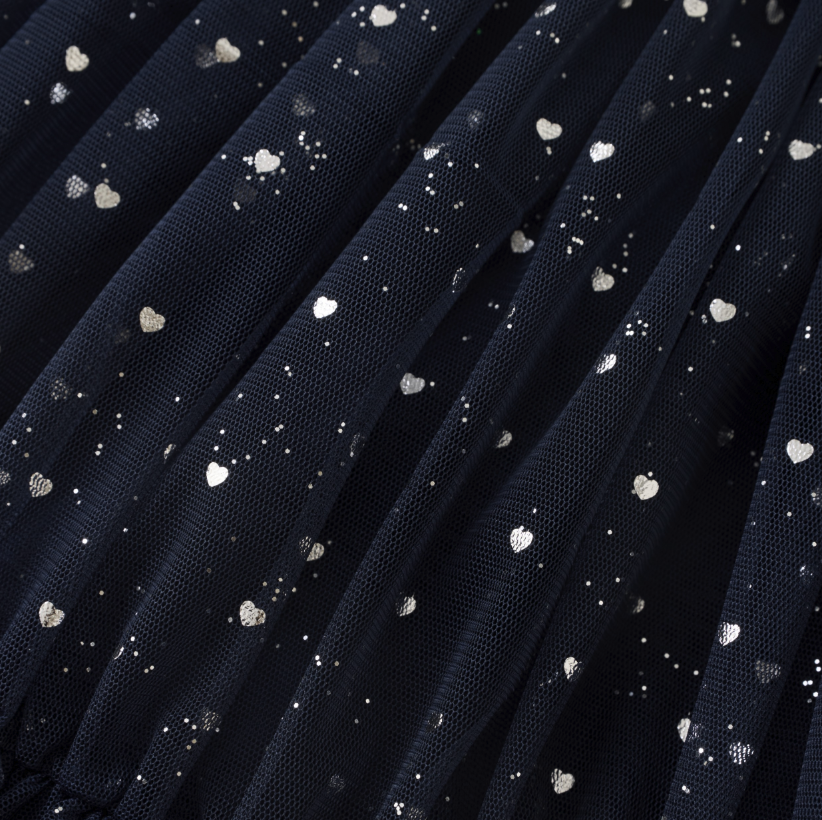 This Black Iris Twirl Mesh Dress is perfect for big girls ready to shine at fall and winter celebrations. Adorned with silver sparkle hearts, it adds a magical touch to holiday parties, Christmas, and New Year's Eve. The twirl-worthy mesh fabric ensures fun and movement, making every moment feel festive and playful.