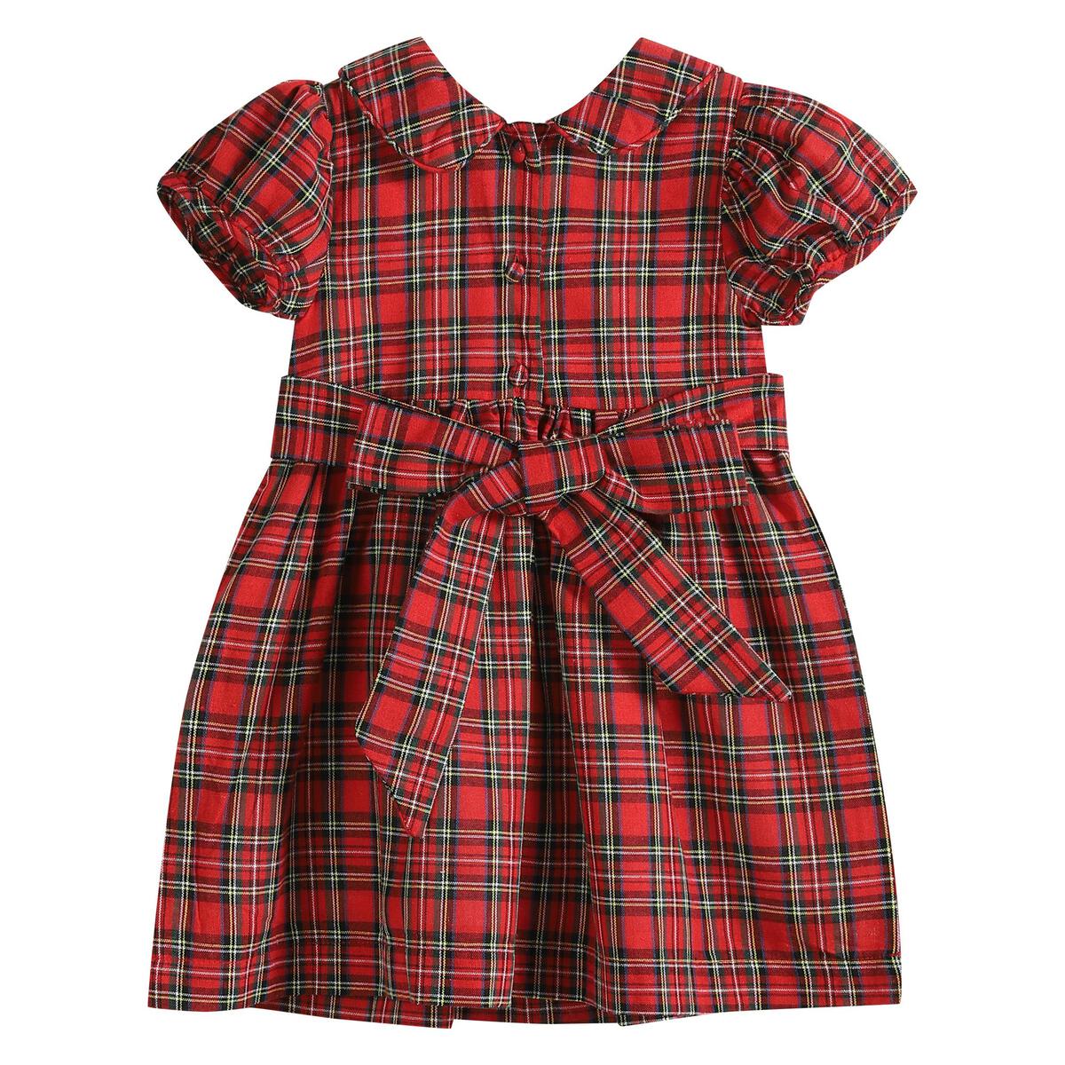 Charming for Christmas! This beautiful red plaid dress by Lil Cactus features pretty Santa embroidery, a peter pan collar, a tie-up bow back, and smocking. Made in 100% soft cotton ensure your little sweetie is comfortable all day long. A fun and vibrant outfit for your cutie and all of her Christmas fun. From getting photos with Santa to decorating the tree; no matter the occasion she will be looking picture-perfect!
