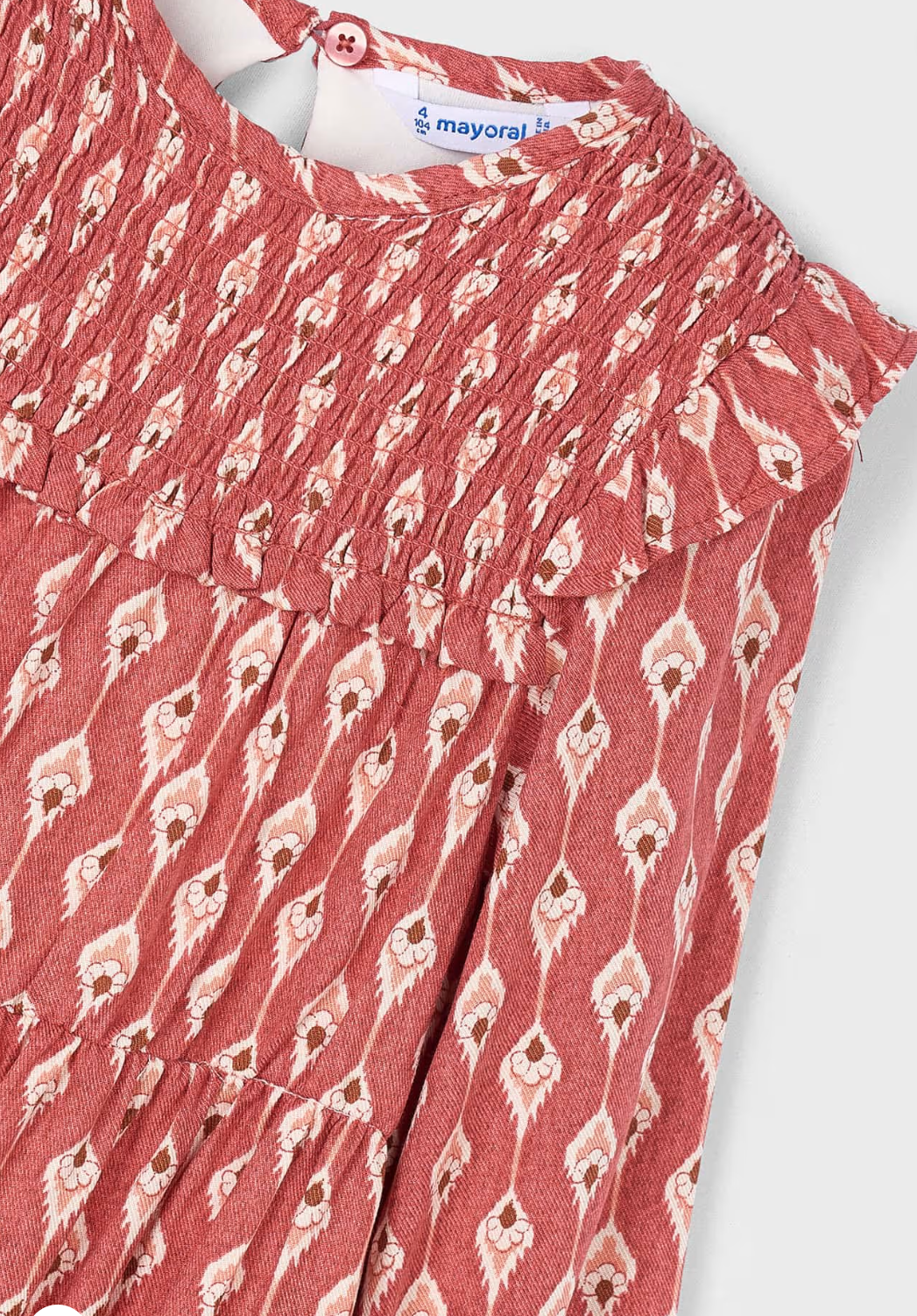 Dress with long sleeves for girls with ruffles on the shoulders. Round neckline. Single button fastening. Warm fabric, ideal to wear on the coldest days. This model has honeycomb detailing. Gathered design. Patterned design.