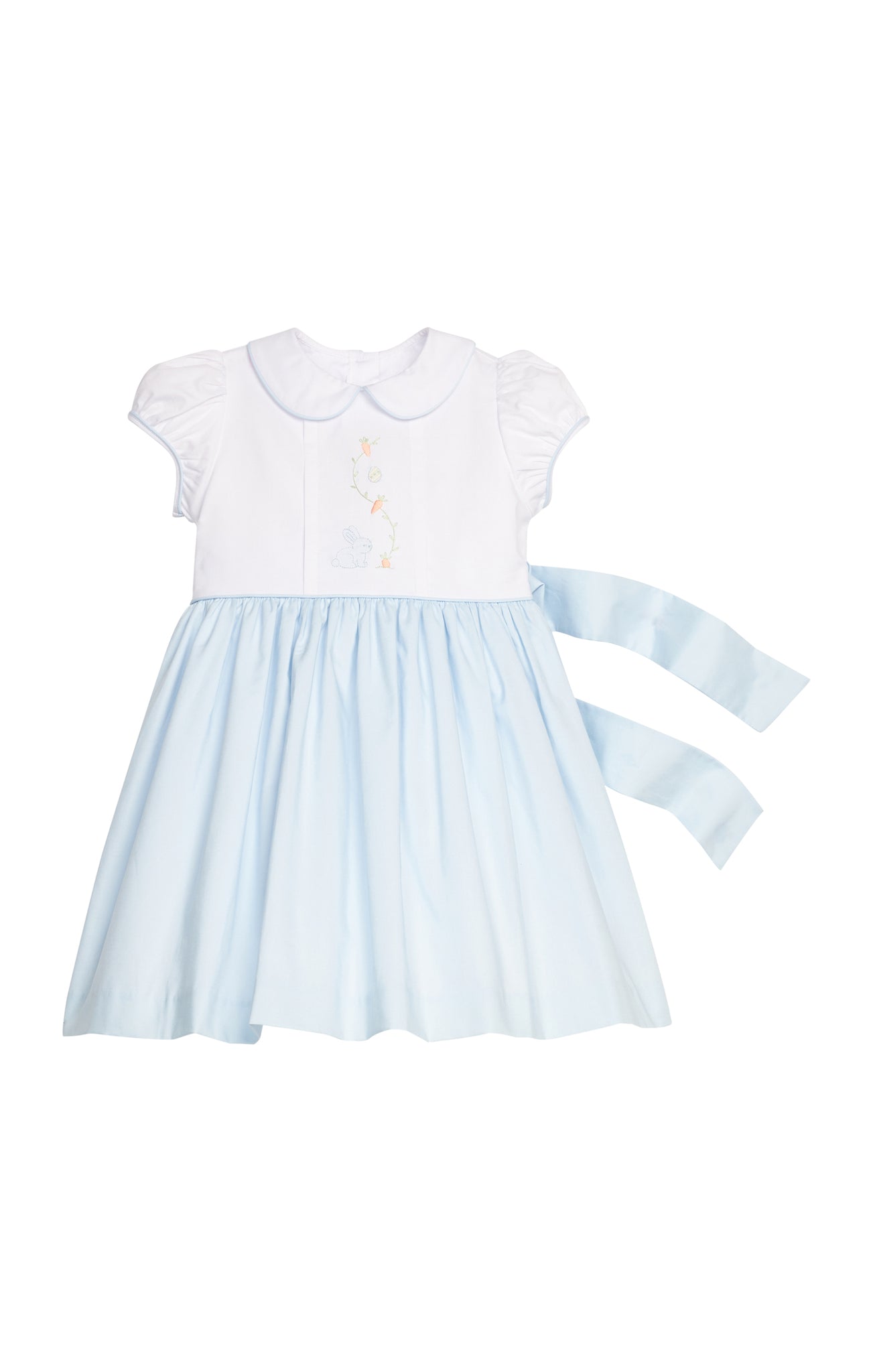 This Blue Bunny Peter Pan dress brings springtime charm with its delightful bunny and carrot appliqué details. Designed with refined sophistication, it's an ideal choice for Easter celebrations and festive occasions. The sweet embellishments capture the spirit of the season while the classic Peter Pan silhouette ensures timeless appeal. Perfect for creating memorable moments, this dress combines playful elegance with quality craftsmanship that discerning parents appreciate.