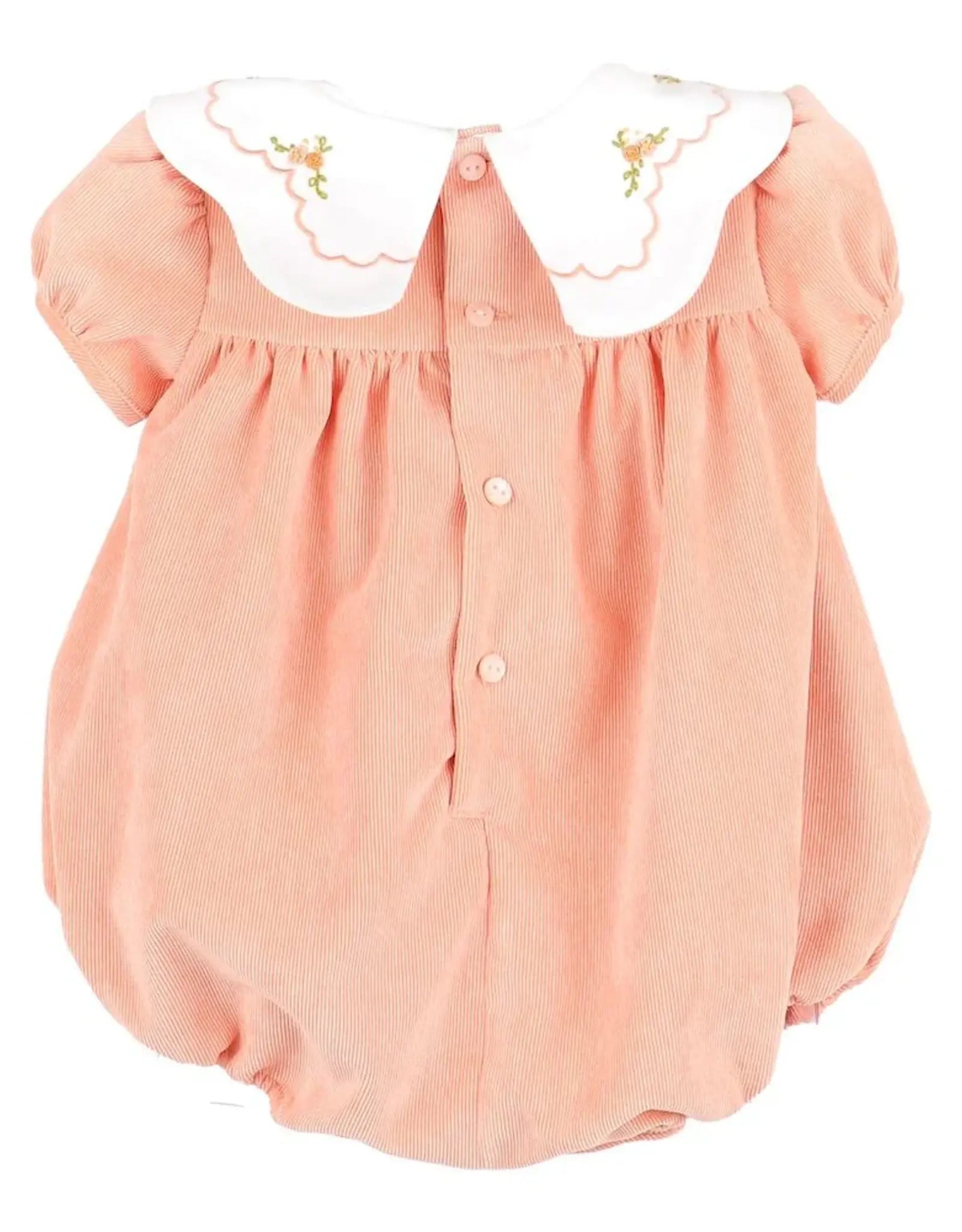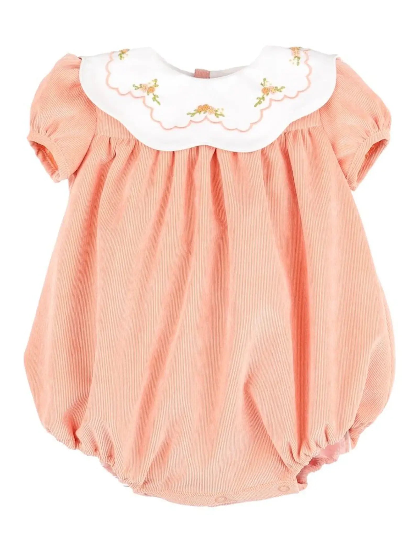 Dress your little one in cozy charm with this Pumpkin Corduroy Scallop Bubble. Featuring a soft orange corduroy fabric and a crisp white scalloped collar adorned with delicate autumn floral embroidery, it’s perfect for fall festivities like Halloween and Thanksgiving. The bubble design offers comfort and ease for babies and toddlers, making every moment playful and stylish this season.