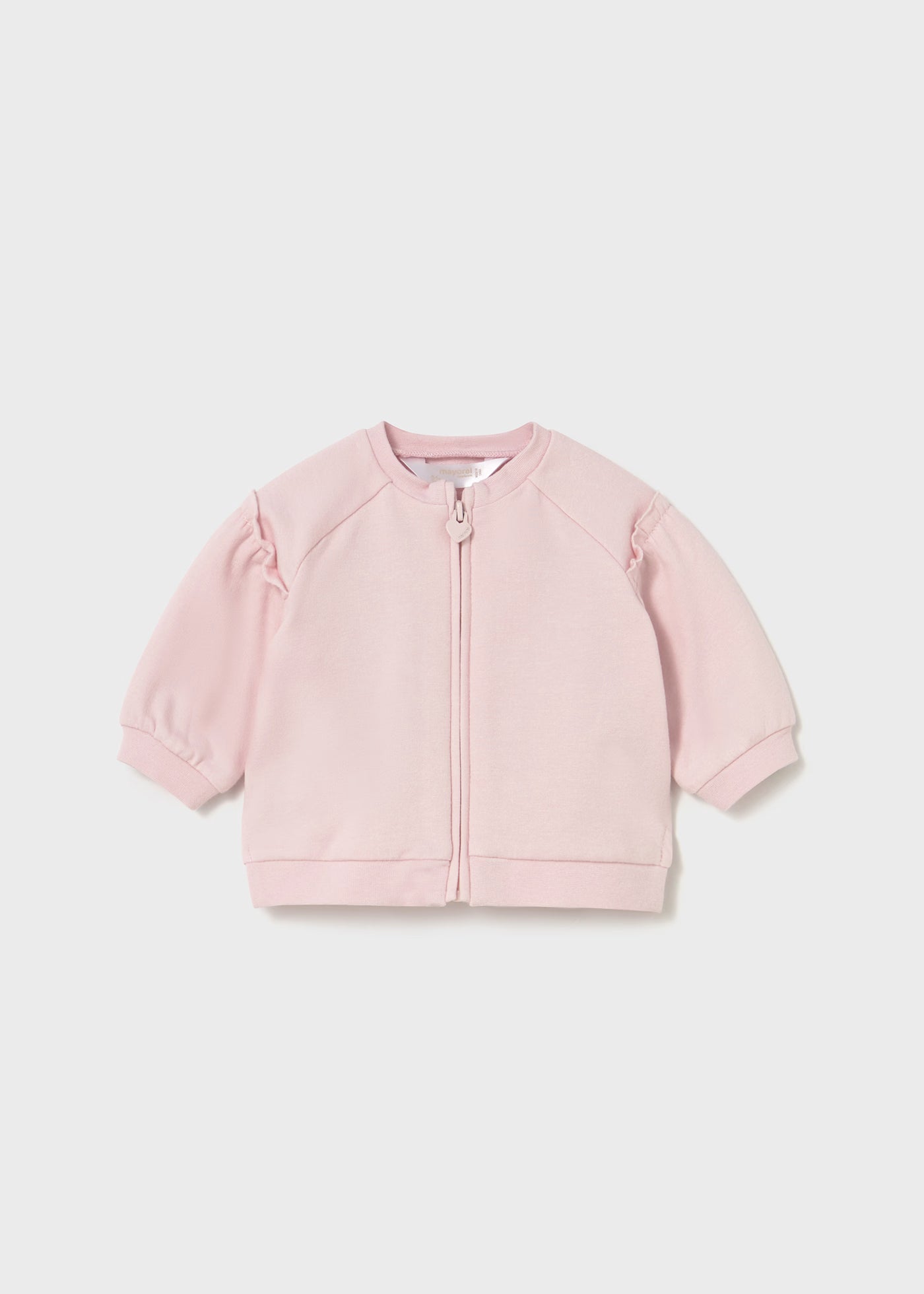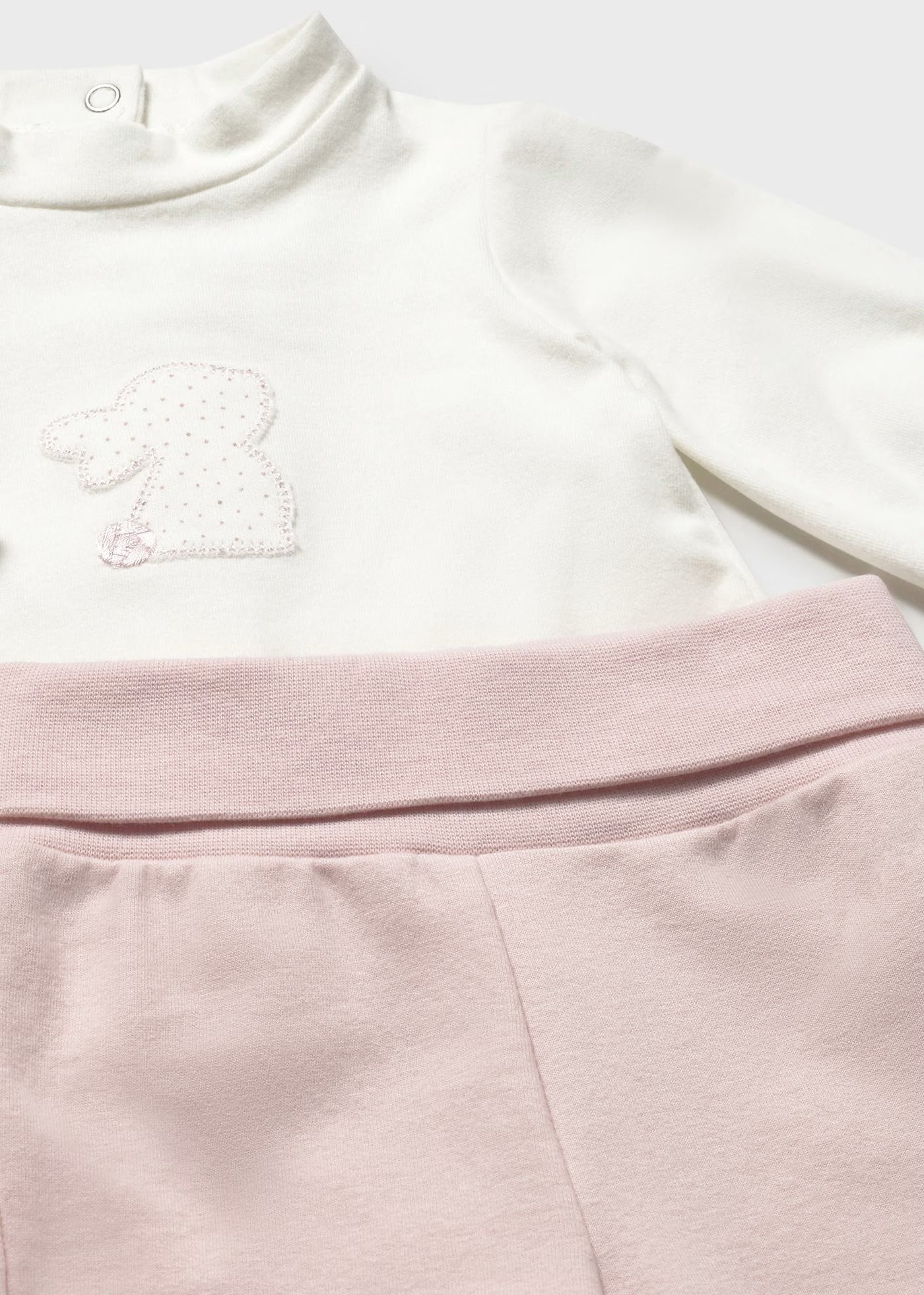 This adorable three-piece tracksuit set for newborn baby girls includes a baby pink sweatshirt, joggers, and a coordinating t-shirt. The long-sleeve hoodie features a central front zip and ribbed accents, perfect for cozy comfort. The matching tee shows a cute bunny applique with elastic cuffs and a high neck collar secured by snaps at the back. Soft pink joggers complete the set with an elastic waistband and ribbed trim for a snug fit. Designed to keep your little one snug and stylish from head to toe!