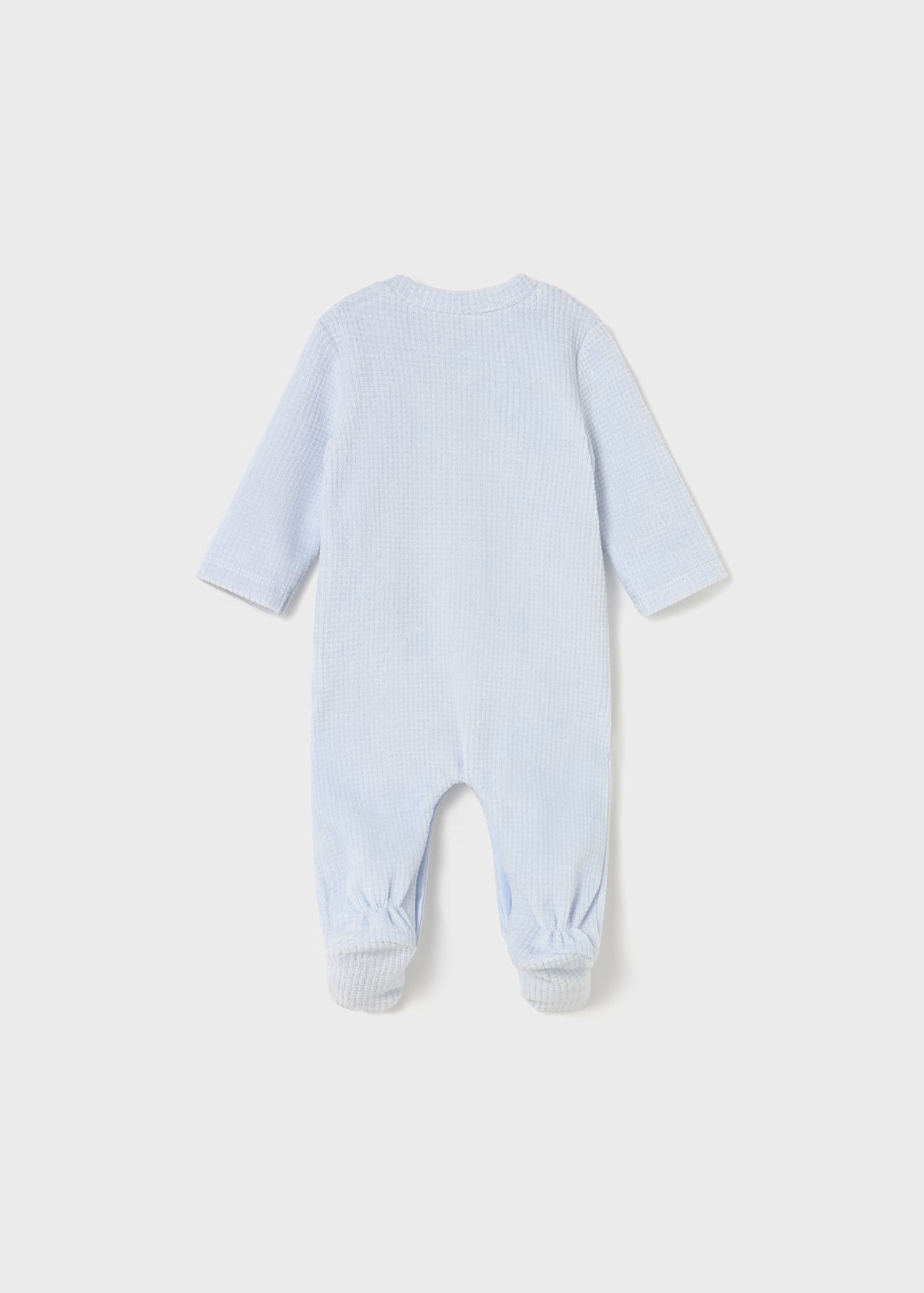 This Cloud Blue Bunny Velour Footie is a snug, long-sleeve romper perfect for your little one. It showcases an adorable brown, fuzzy bunny wearing a blue sweater applique on the chest. With a soft, round neckline and handy snap buttons along the front and crotch, diaper changes are a breeze. Crafted from plush velour cotton, it keeps your baby cozy all day long. The larger sizes (12 and 18 months) include grippy soles to help toddlers stay steady on their feet. Delightful, embroidered details make this outfit extra special and fun!