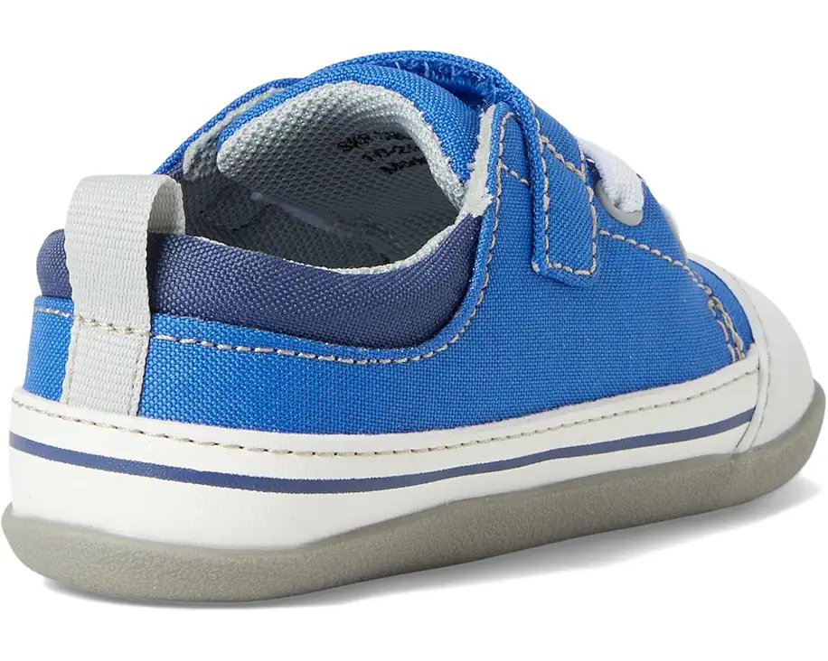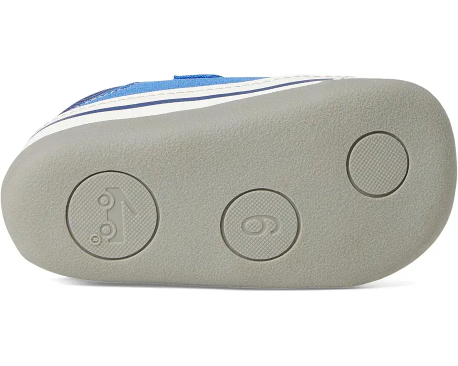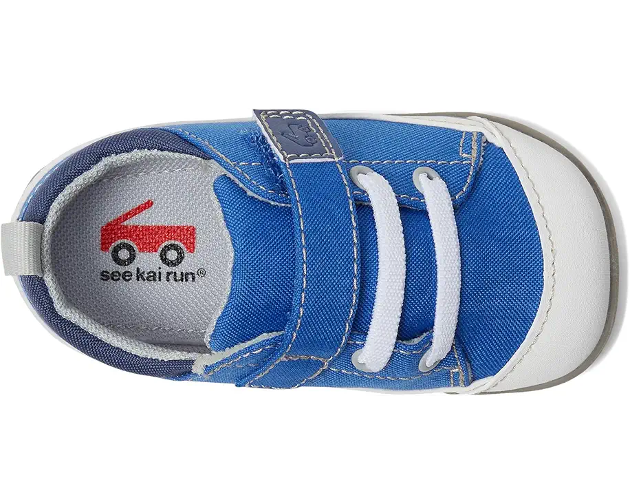 Watch your little one's world expand with every step in the Stevie Mini Kelly Blue. Crafted from classic gray denim with recycled polyester and faux-leather accents, this lightweight first walker combines style with purpose. The flexible rubber outsole and generous toe box give tiny feet room to grow, while the recycled mesh lining keeps things breathable and comfy. A rubberized toe cap adds extra protection for those curious toes. Designed by See Kai Run® to support healthy foot development and awarded the APMA Seal of Acceptance, these shoes are built for budding adventurers ready to explore.